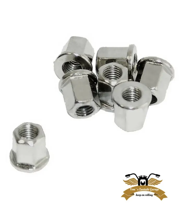 Die Muttern für die Stehbolzen sind erhöht mit einem Flansch. Die Stehbolzen Muttern bieten eine saubere Optik da sie verchromt sind. Die Bundmuttern eigenen sich für diverse Mopeds und Mofas mit M6 Stehbolzen und überzeugen neben einer wertigen Optik mit sauberer Verarbeitung und sicherem Halt.