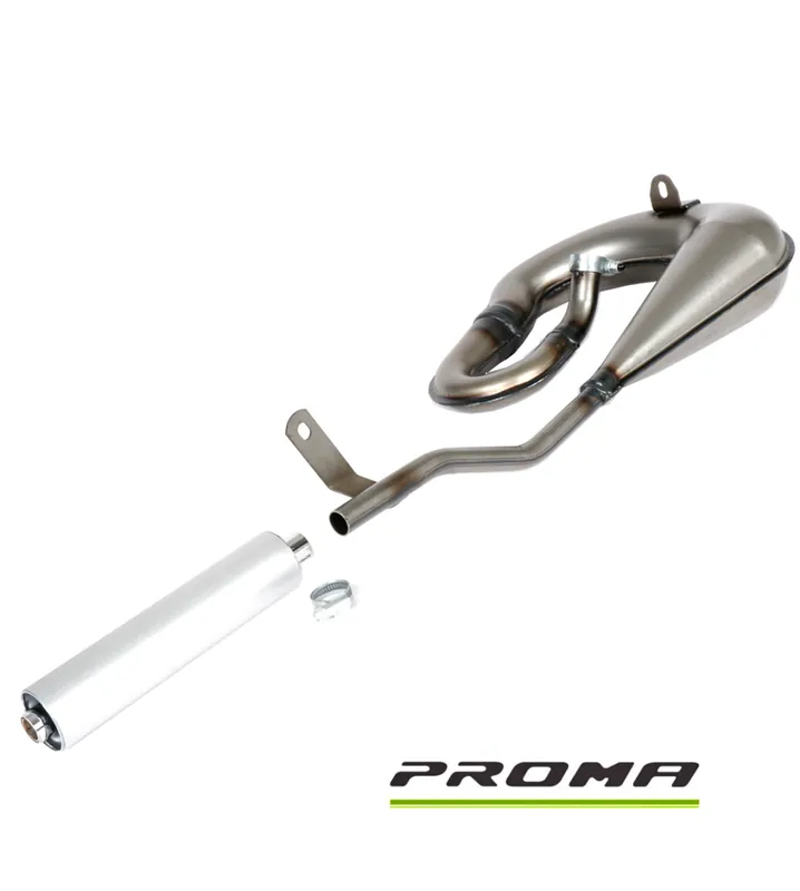 Tuningauspuff von Proma für leichtes bis mittleres Tuning. Die Führung des Auspuffrohres erlaubt es, den Auspuff mit dem serienmäßigen Hauptständer zu fahren. – Der Tuningauspuff für die Piaggio Ciao und Bravo eignet sich sehr gut sowohl für den Standardzylinder als auch für Tuningzylinder bis 65 ccm. Der Proma Circuit bringt insbesondere im mittleren Drehzahlbereich einen erheblich bessern Durchzug. Das Ciao Ersatzteil hat einen 22mm Anschluß. Der Endtopf aus mattem Aluminium in Verbindung mit dem Schnecken Design unterstreicht den sportlichen Anspruch des Proma Circuit Endschalldämpfers.